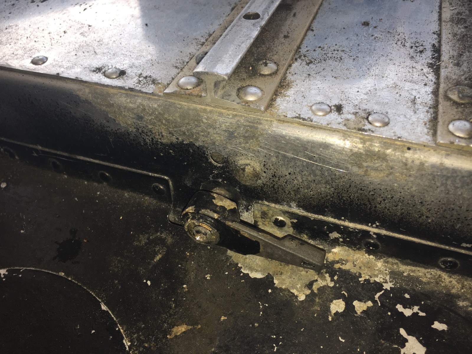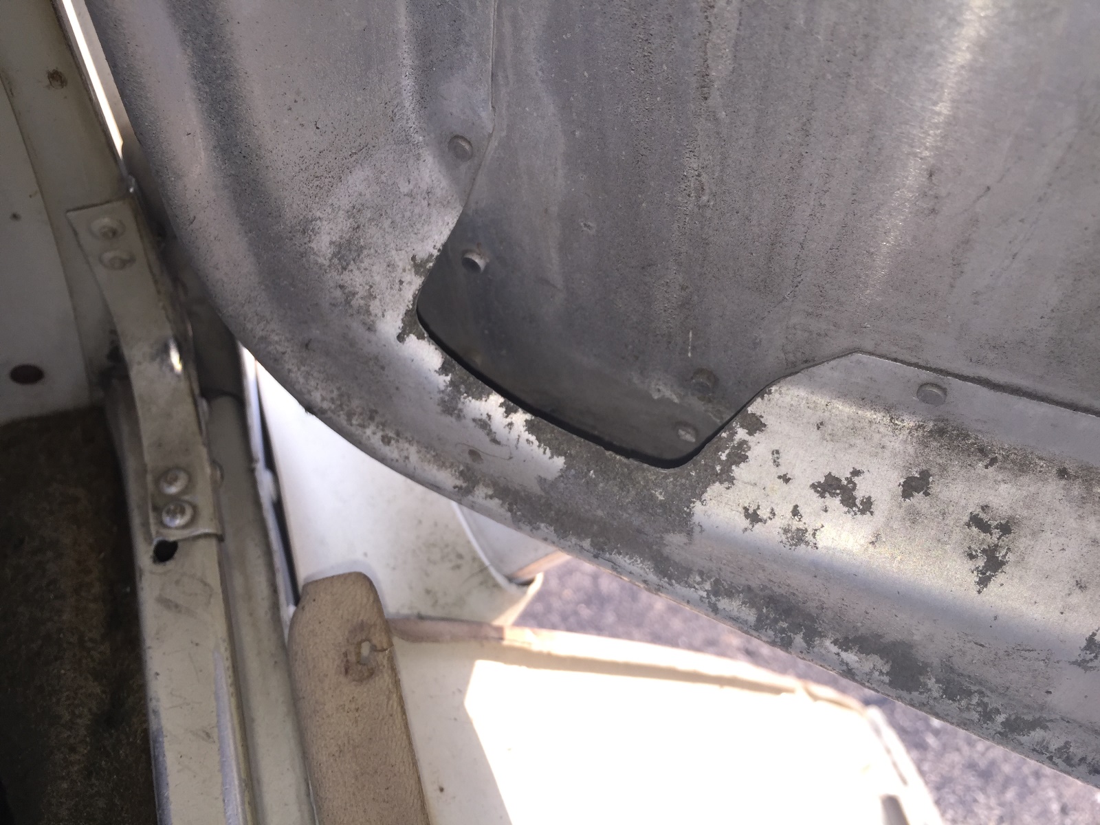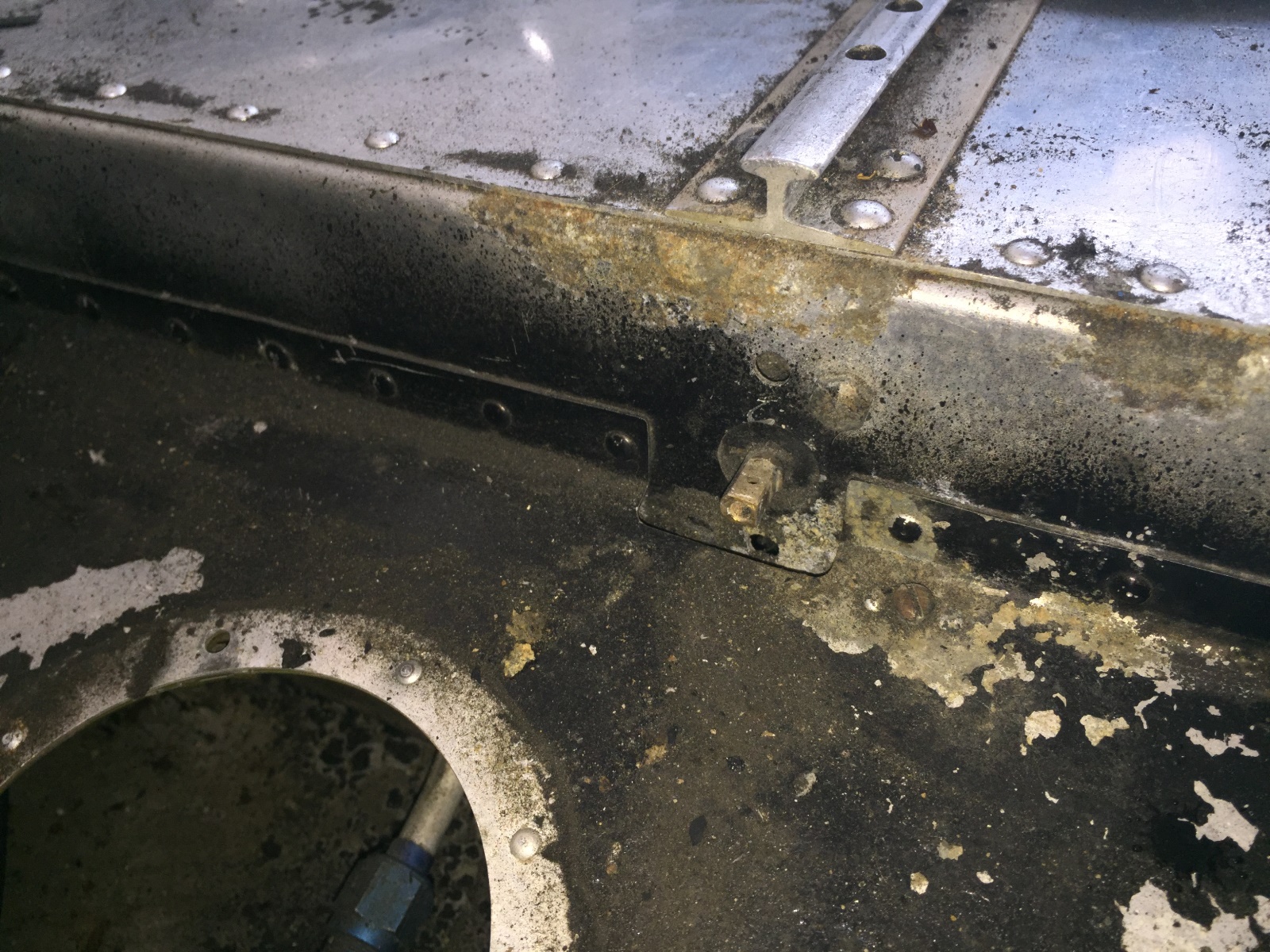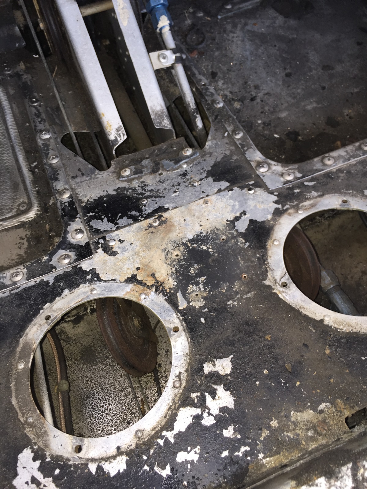 I just got back from another round of corrosion hunting, and I found my fair share of skeletons this time. It certainly won't help the "for" case, by any means. I completely removed the carpet and found the floor pan roughly painted black, corrosion under the fuel shutoff placard, more corrosion on the pan around the fuel shutoff valve, and a nice crack in the seat pan on the passenger's side. I pulled the wingtips, and everything looks really good inside the wings given the condition of everything else, other than the damaged right wingtip that is. mad