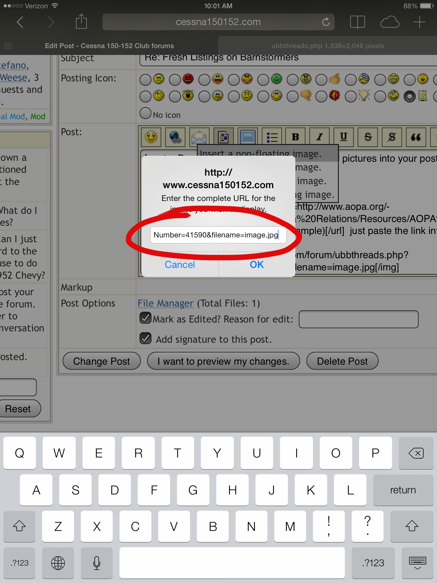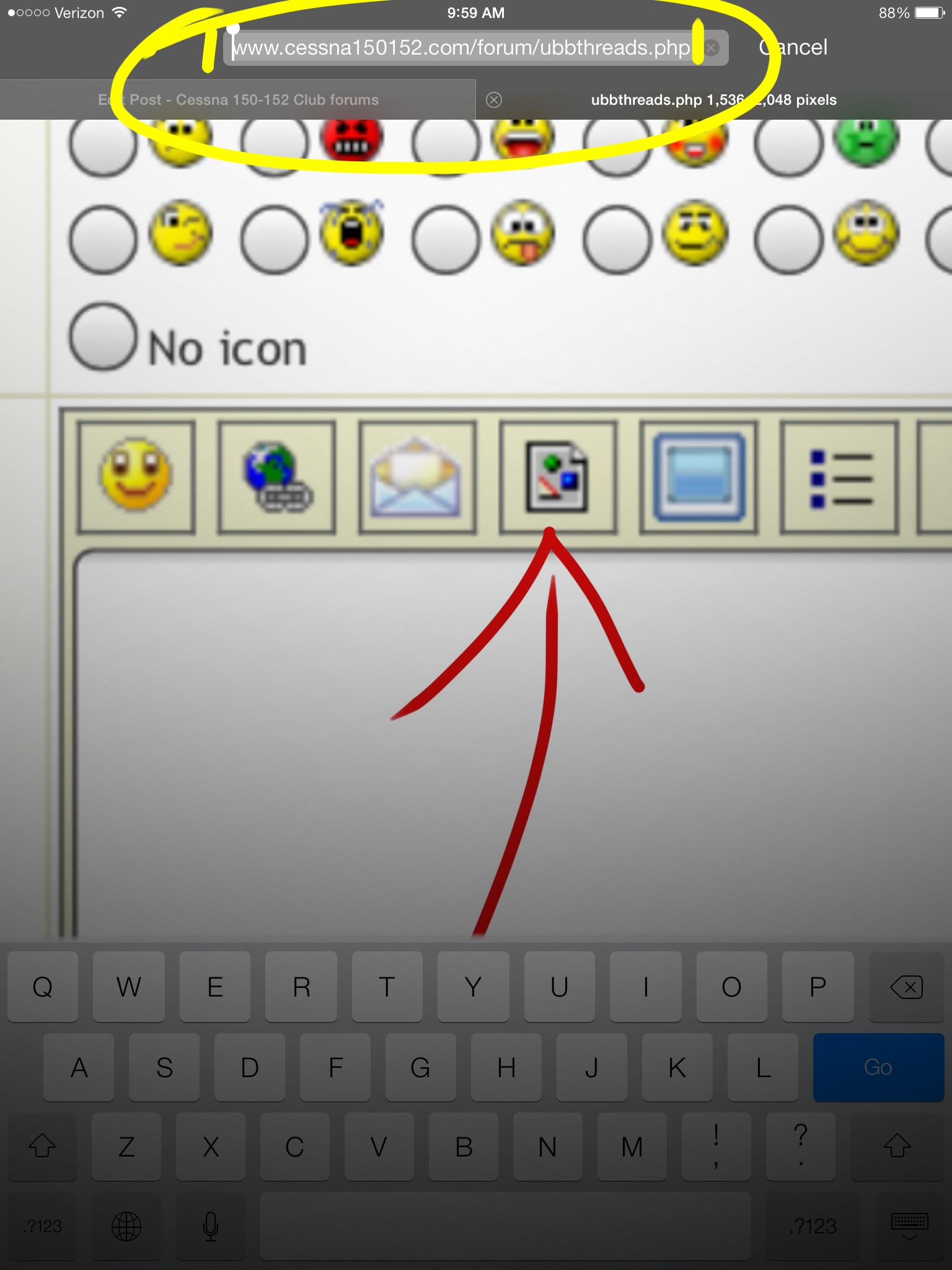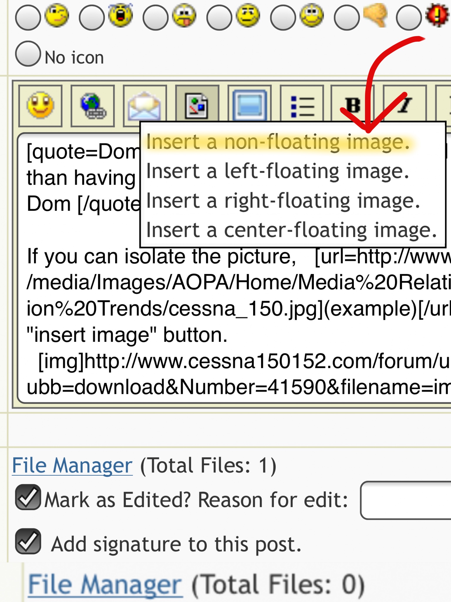 If you can isolate the picture, (example) [aopa.org] just paste the link into the box of the "insert image" button.